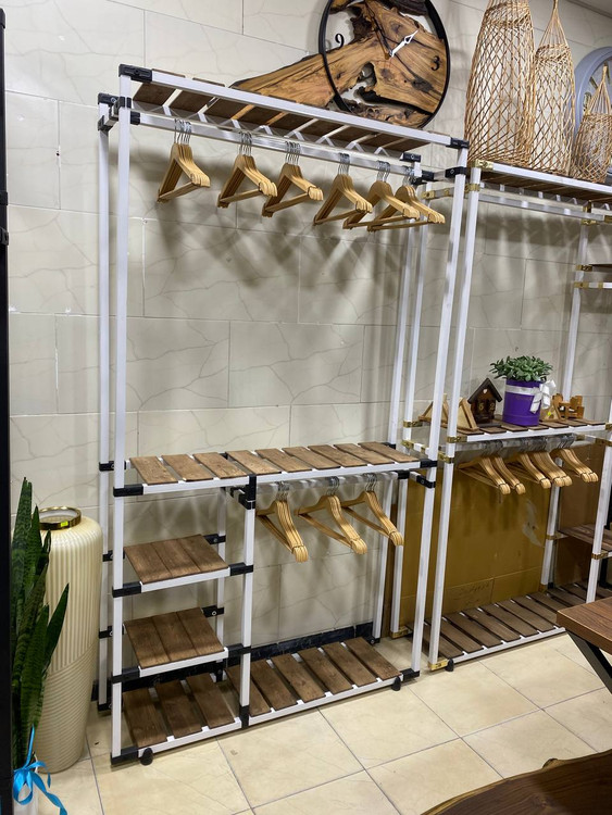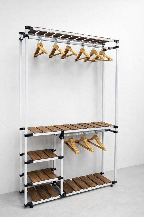 ساختار دو طبقه این رگال امکان آویز کردن لباس در بخش بالا و پایین را فراهم کرده و طبقات چوبی آن فضای مناسبی برای قرار دادن کیف، کفش یا اکسسوری ایجاد میکند. استفاده از رنگ کورهای باعث افزایش دوام، مقاومت در برابر رطوبت و خط و خش شده و آن را مناسب استفاده طولانیمدت میسازد.